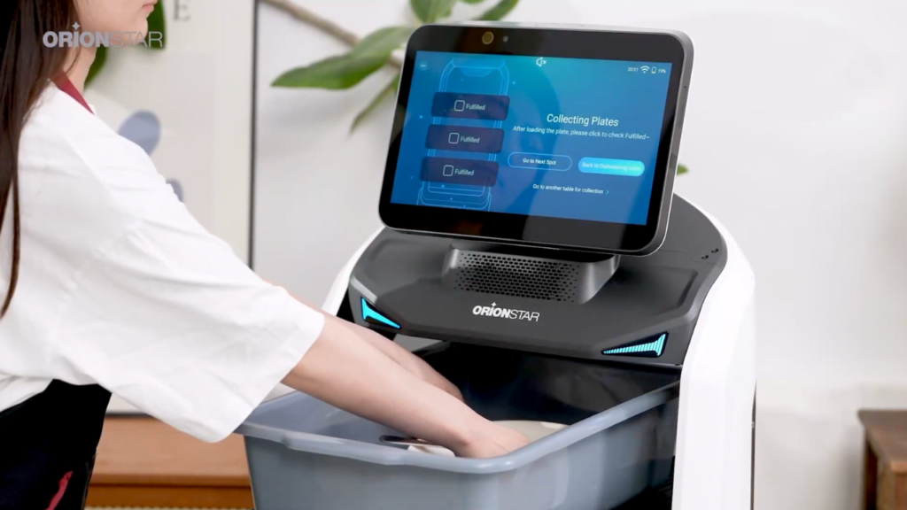 Tryb dedykowany do sprzątania. Robot podjeżdża do stolików, umożliwiając kelnerom szybkie odłożenie brudnych naczyń, a następnie samodzielnie zawozi je do zmywaka.